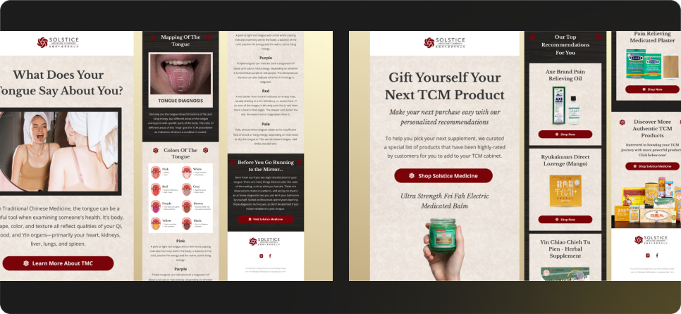 Email marketing remains a critical channel for direct-to-consumer brands. With Solstice Medicine, we established a robust email strategy to increase revenue and strengthen brand loyalty. By crafting compelling email content that varied from educational pieces on the history of Chinese medicine to highlights of best-selling products and the benefits of TCM, we ensured each campaign was informative and engaging. This strategy effectively deepened the connection between Solstice Medicine and its expanding customer base.