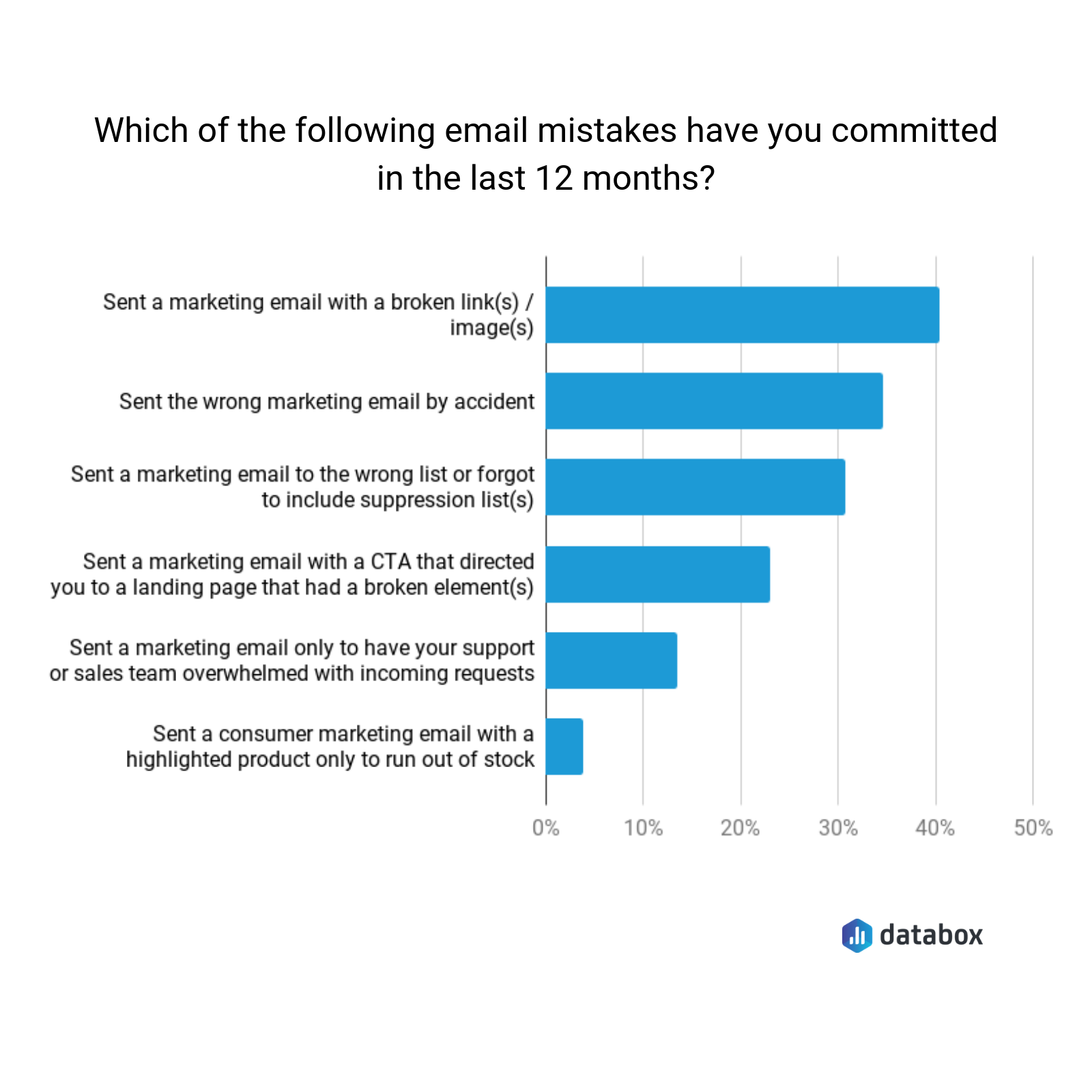 For our latest survey, we asked 51 marketers to tell us more about the mistakes they’ve made when sending marketing emails. The most common mistakes include sending an email with a broken link or image, accidentally sending the wrong email, and sending an email to the wrong list: