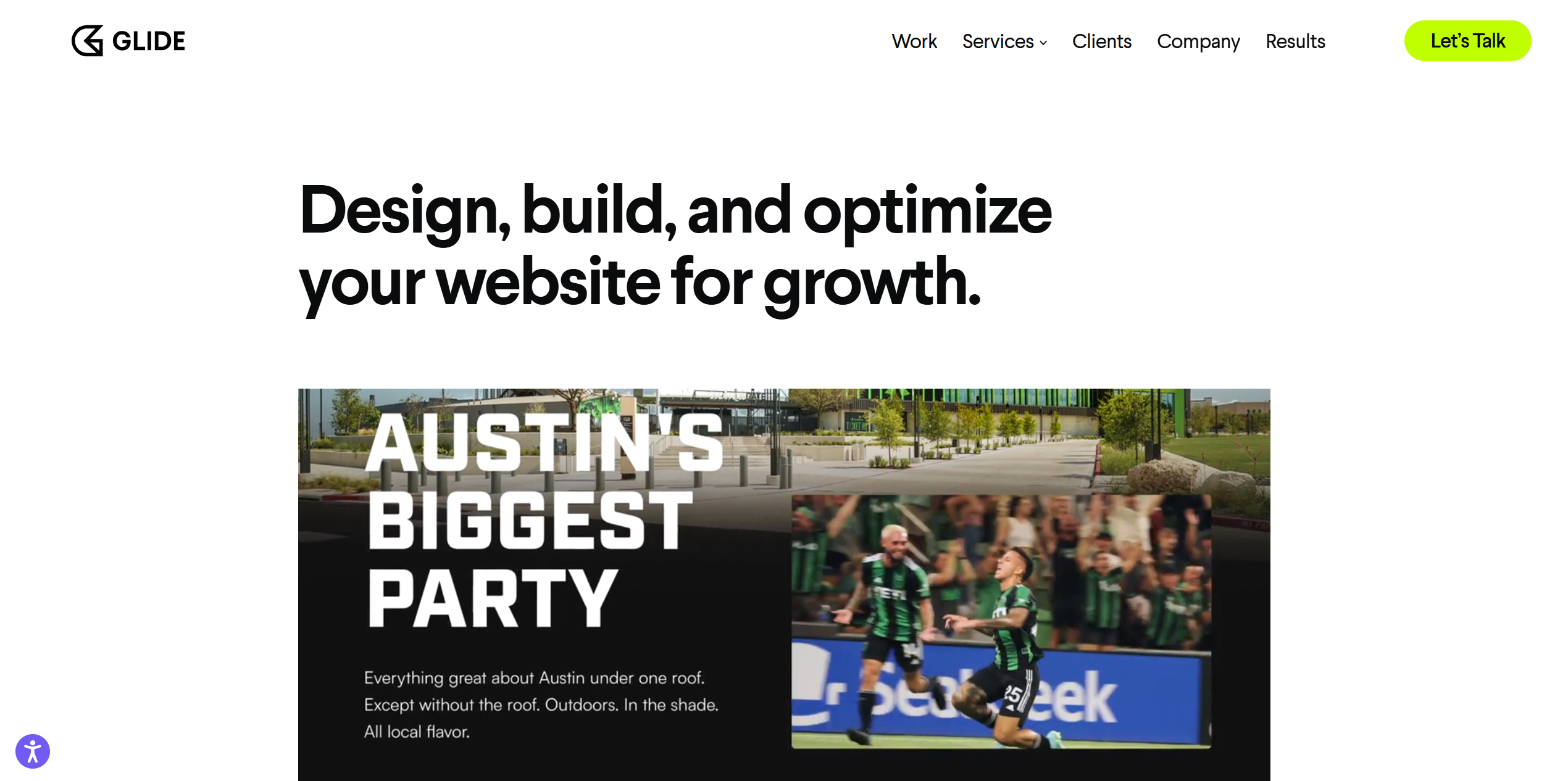 GLIDE, based in Austin, Texas, is a Certified B-Corp and Climate Neutral Certified agency with over 20 years of experience. GLIDE is known for crafting custom websites that help purpose-driven organizations create a meaningful impact. From best-in-class web design to comprehensive digital marketing support, GLIDE focuses on scaling growth for businesses of all sizes. With an emphasis on results, GLIDE delivers beautiful, functional websites that drive measurable business outcomes.
